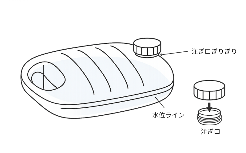 • 水位ライン:本体側面に目印のように書かれているライン。ここまで“水”を入れます。